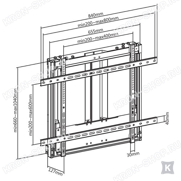 С параметрами VESA 800x600 мм, кронштейн способен выдерживать вес от 40 до 60 кг, что делает его подходящим для разных моделей панелей. Минимальное расстояние от стены составляет всего 127 мм, что идеально подходит для установки в небольших помещениях или там, где пространство ограничено.