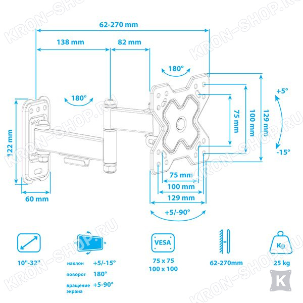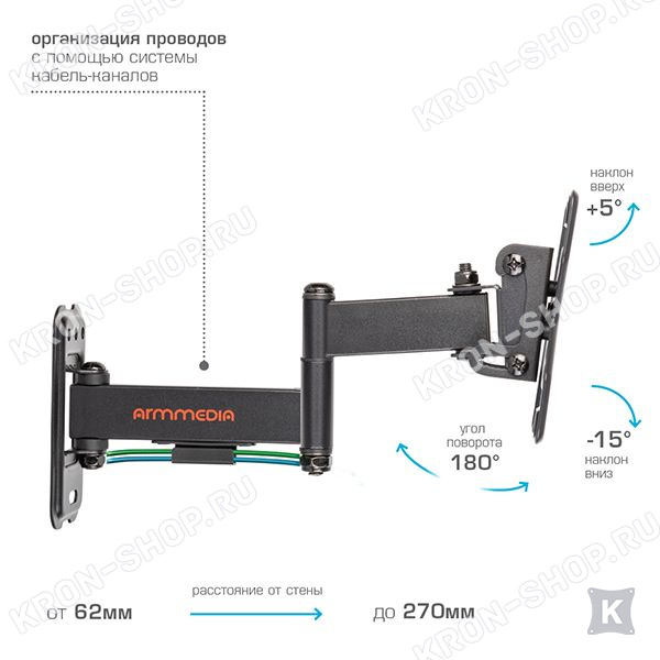 Экран ТВ можно наклонять до -15°, регулировать вынос от стены от 62 до 270 мм, что делает его использование крайне удобным.