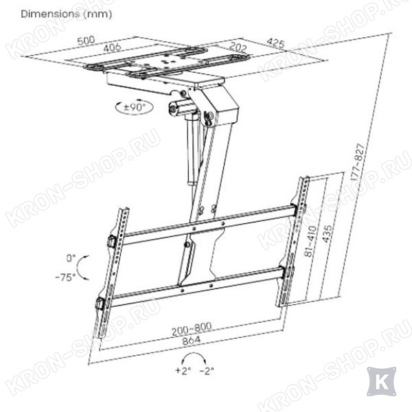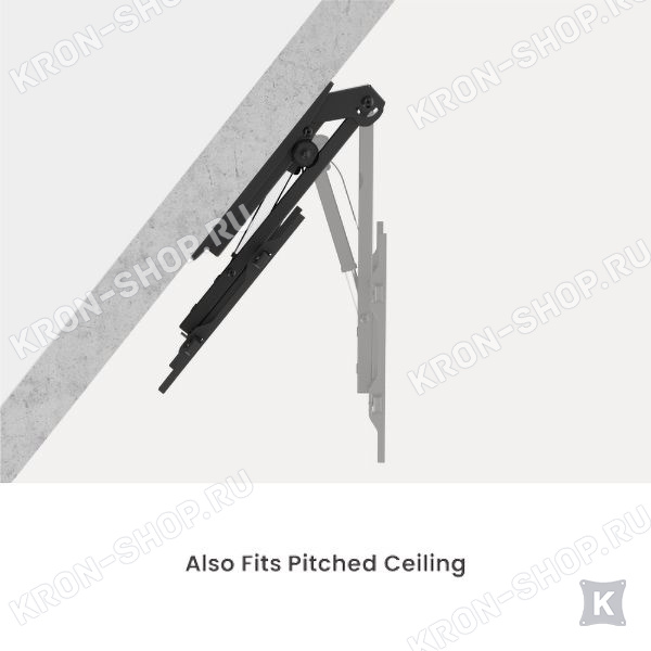 Откидной потолочный моторизированный кронштейн PLB-M0748DS может крепиться на наклонную поверхность. Угол наклона телевизора регулируется в пределах 75 градусов.