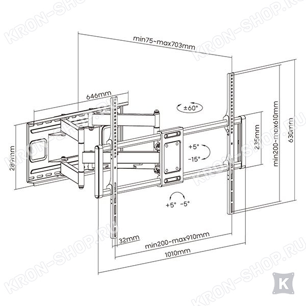 Поворотно-наклонный кронштейн Exell EXi-X9996-HD для телевизоров с диагональю 52–120 дюймов использует инновационные материалы и продвинутые технические решения. Благодаря этому он не только выдерживает вес до 135 кг, что гарантирует безопасность, но и обеспечивает полный диапазон движений, включая выдвижение от 75 до 703 мм, наклон -15°/+5°, поворот ±60°, коррекцию уровня ±5°. Выдвигать или складывать кронштейн еще никогда не было так просто – улучшенная конструкция со встроенными медными втулками двигается максимально плавно. Два многофункциональных кабельных зажима элегантно скрывают, защищают и поддерживают кабели.