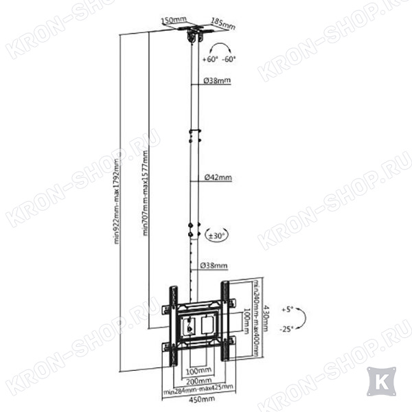 Телескопический потолочный наклонно-поворотный кронштейн для телевизоров и мониторов с диагональю от 32 до 70 дюймов.