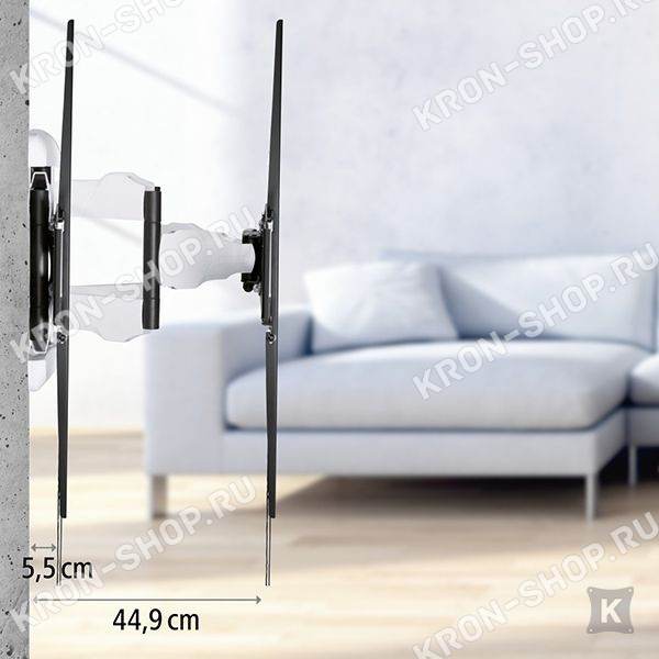 Всего 5,5 сантиметра расстояния между стеной и телевизором в сложенном виде. Фактически кронштейн Hama R1118178 незаметен для глаза.