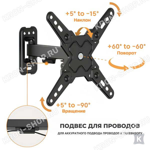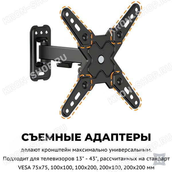 Настенный поворотно-наклонный кронштейн для телевизоров и мониторов с диагональю от 13 до 43 дюймов.