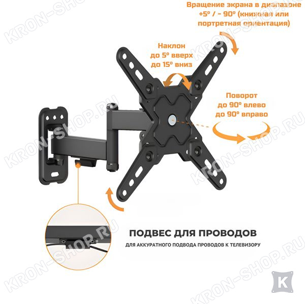 Настенный поворотно-наклонный кронштейн для телевизоров и мониторов с диагональю от 22 до 42 дюймов.