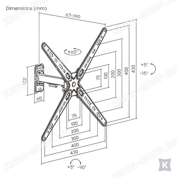 Кронштейн iTECHmount LCDN741 отодвигается от стены на 199 мм, угол наклона экрана до 15 градусов, угол поворота до 90°.