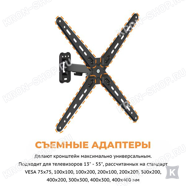 Настенный поворотно-наклонный кронштейн для телевизоров и мониторов с диагональю от 13 до 55 дюймов.