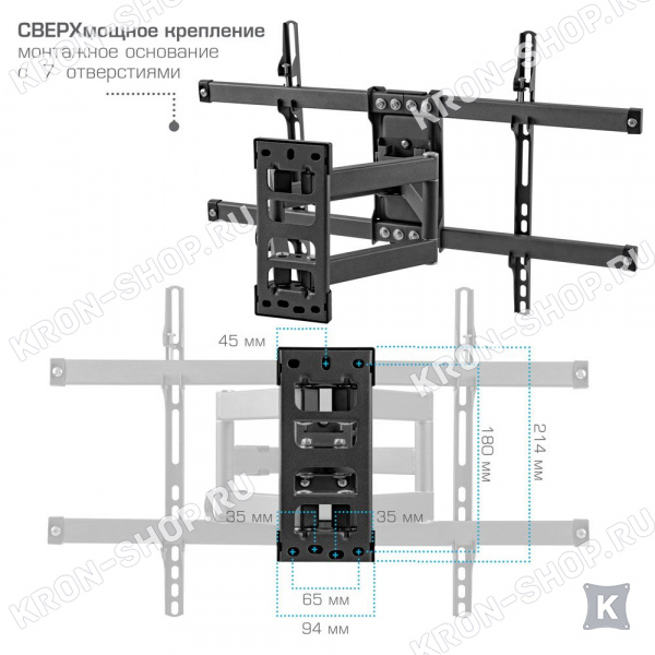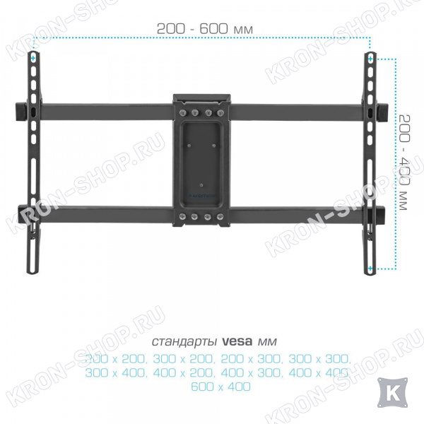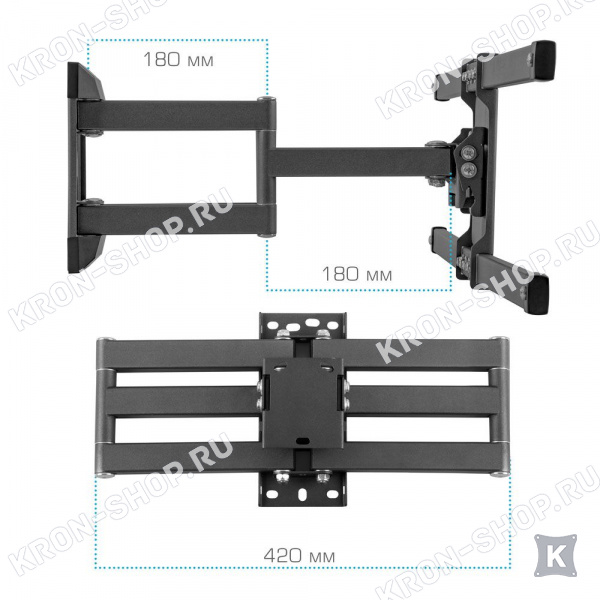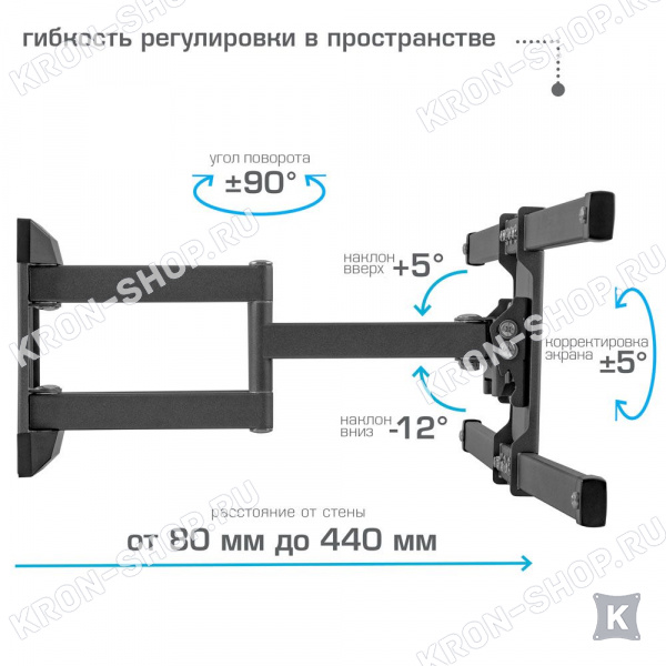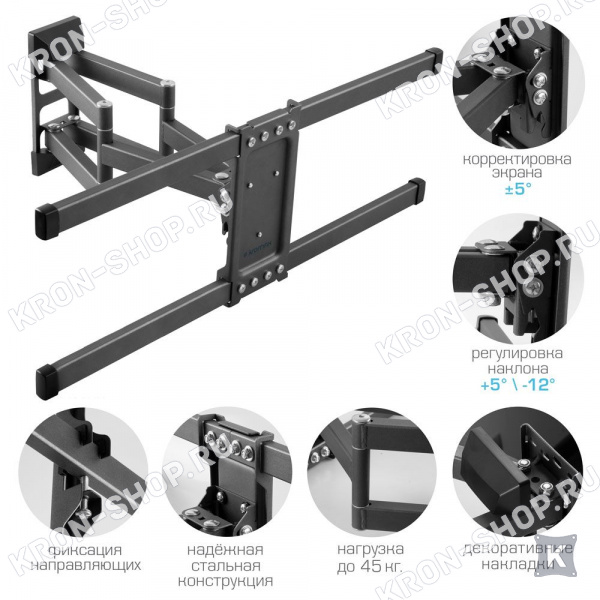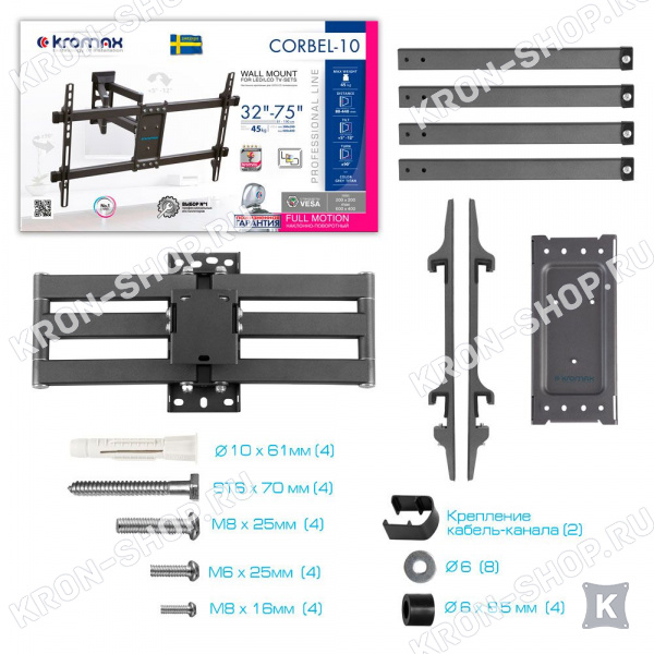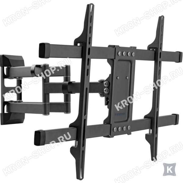 Удобство использования кронштейна Kromax Corbel-10 обеспечено четырьмя подвижными «коленами», что позволяет менять дистанцию удаленности телевизора от стены в диапазоне от 80 до 440 мм. Монтажные отверстия в кронштейне расположены в соответствии со стандартом VESA с максимальным расстоянием 600x400 мм.