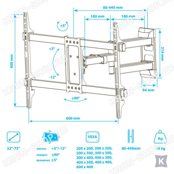 Настенный поворотно-наклонный кронштейн для телевизоров и мониторов с диагональю от 32 до 75 дюймов весом до 45 кг.