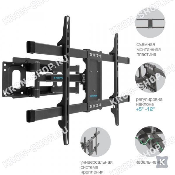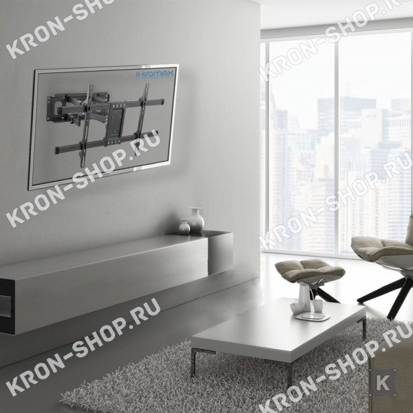Кронштейн Kromax Corbel-8 создан для больших телевизоров и представляет собой наклонно-поворотный настенный кронштейн с углом наклона вверх +5° и вниз 12° и вправо/влево на 160°, что позволяет выбирать наилучший угол обзора. Он предназначен для крепления плоских телевизоров с диагональю от 32 до 75 дюймов и весом до 55 кг. Кронштейн Kromax Corbel-8 максимально подвижен во всех направлениях, что позволит вам выбрать наиболее комфортное место расположения телевизора в вашей комнате.
