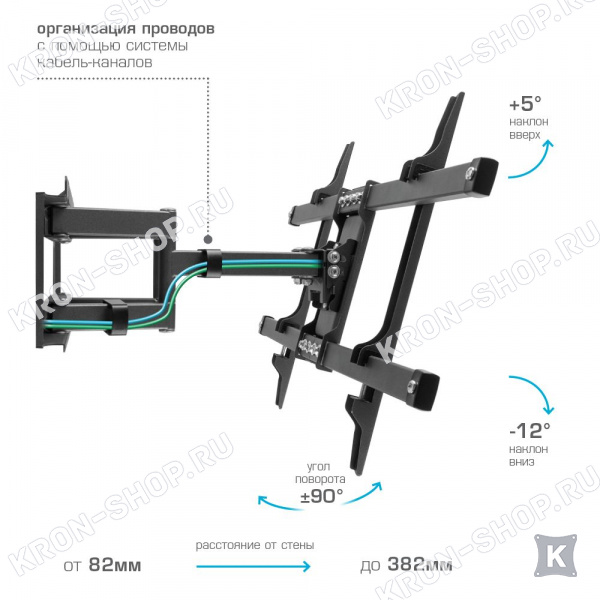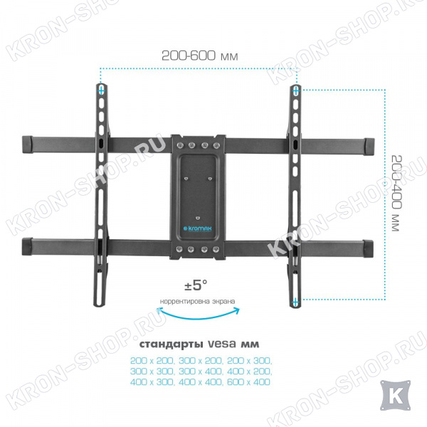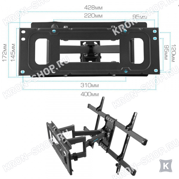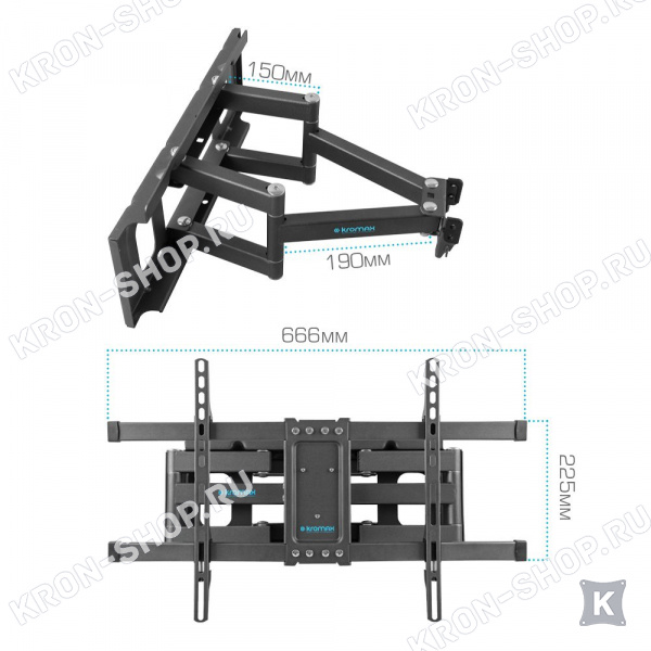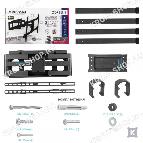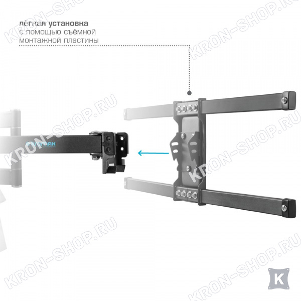 Удобство использования кронштейна Kromax Corbel-8 обеспечено четырьмя подвижными «коленами», что позволяет менять дистанцию удаленности телевизора от стены в диапазоне от 82 до 382 мм. Монтажные отверстия в кронштейне расположены в соответствии со стандартом VESA с максимальным расстоянием 600x400 мм.