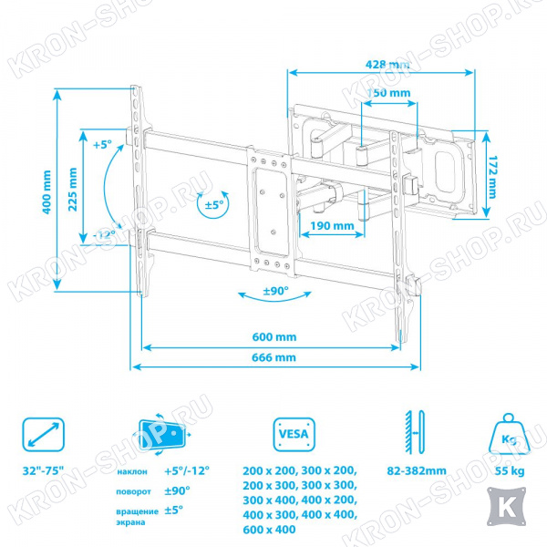 Настенный поворотно-наклонный кронштейн для телевизоров и мониторов с диагональю от 32 до 75 дюймов весом до 55 кг.