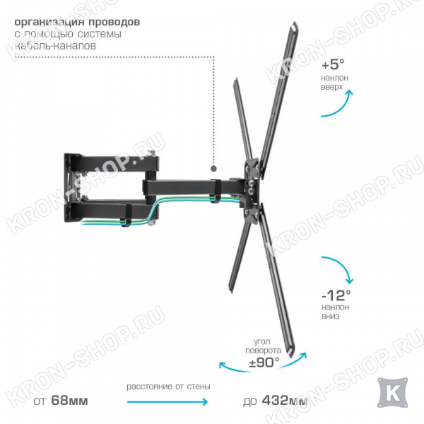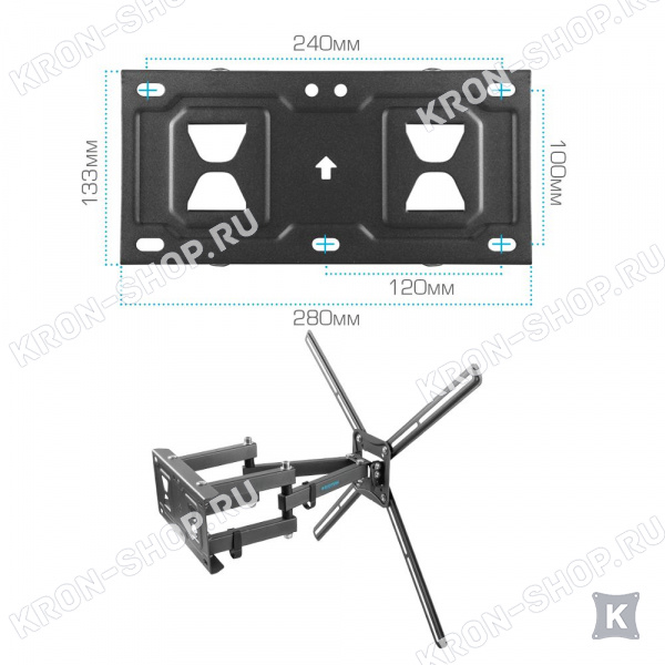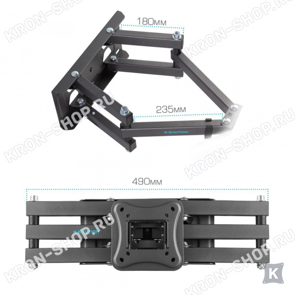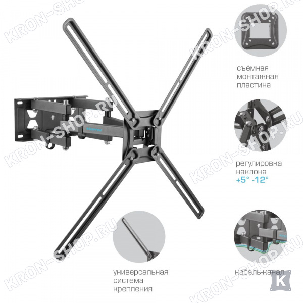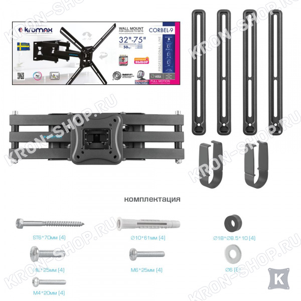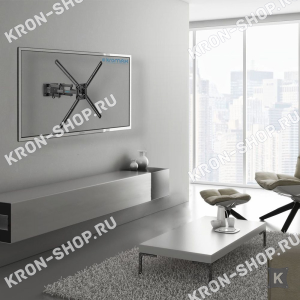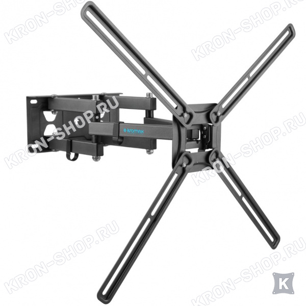 Удобство использования кронштейна Kromax Corbel-9 обеспечено четырьмя подвижными «коленами», что позволяет менять дистанцию удаленности телевизора от стены в диапазоне от 68 до 432 мм. Монтажные отверстия в кронштейне расположены в соответствии со стандартом VESA с максимальным расстоянием 600x400 мм.