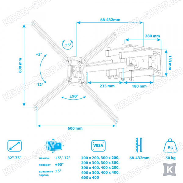 Настенный поворотно-наклонный кронштейн для телевизоров и мониторов с диагональю от 32 до 75 дюймов весом до 50 кг.