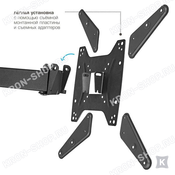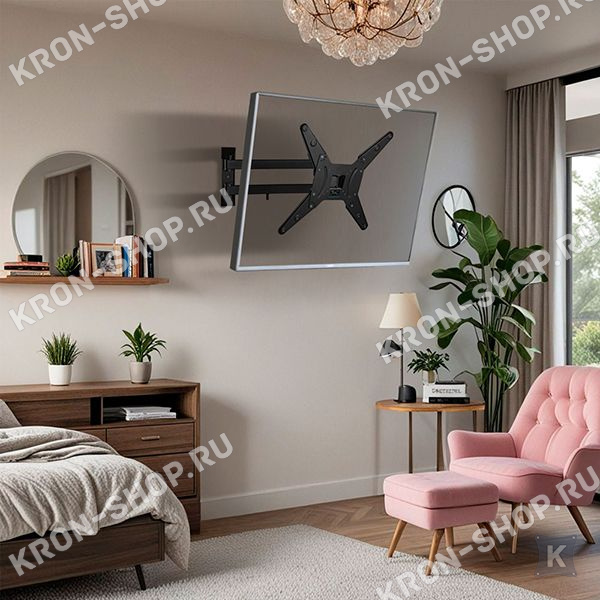 Система шарниров позволяет регулировать положение экрана телевизора, оптимизируя пространство помещения и добиваясь наиболее удобного расположения экрана для просмотра. В комплекте поставки крепления есть вся необходимая фурнитура для монтажа.