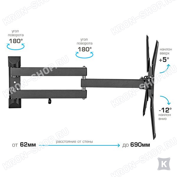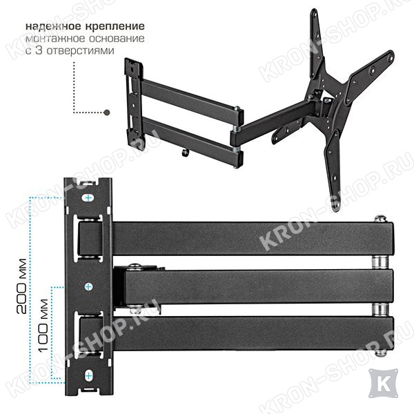 Настенный поворотно-наклонный кронштейн для телевизоров и мониторов с диагональю от 40 до 90 дюймов.