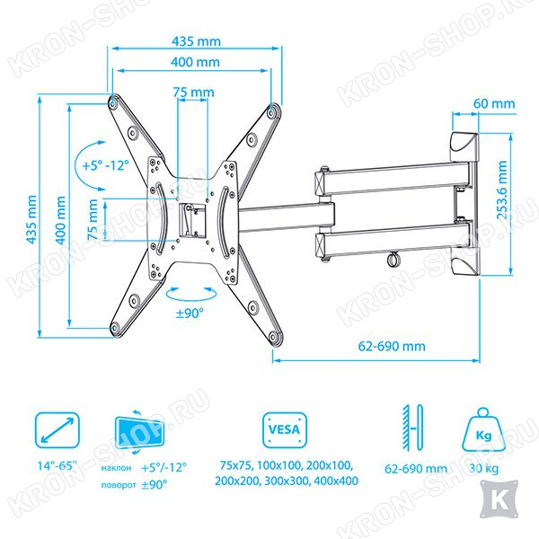 Настенный наклонно-поворотный кронштейн для телевизоров и мониторов с диагональю от 14 до 65 дюймов.