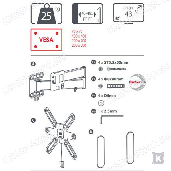 OFA WM6252 – наклонно-поворотный кронштейн для телевизора или монитора с диагональю экрана от 13 до 43 дюймов (33-110 см) и максимальным весом до 25 кг.