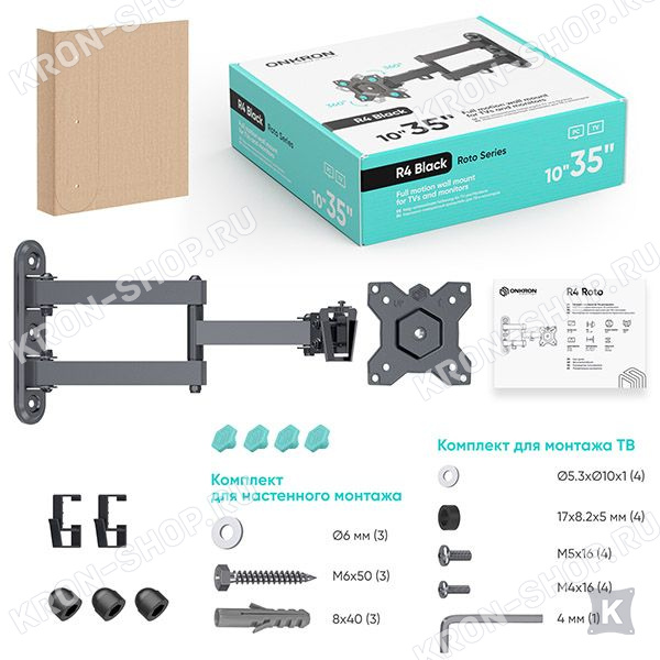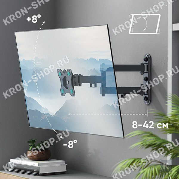 Кронштейн Onkron R4 подходит для телевизоров с диагональю от 10" до 35". Конструктивно данный телевизионный кронштейн является наклонно-поворотным с изменяемым расстоянием от стены до 420 мм и с возможностью вращения 360 градусов.