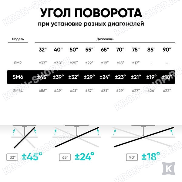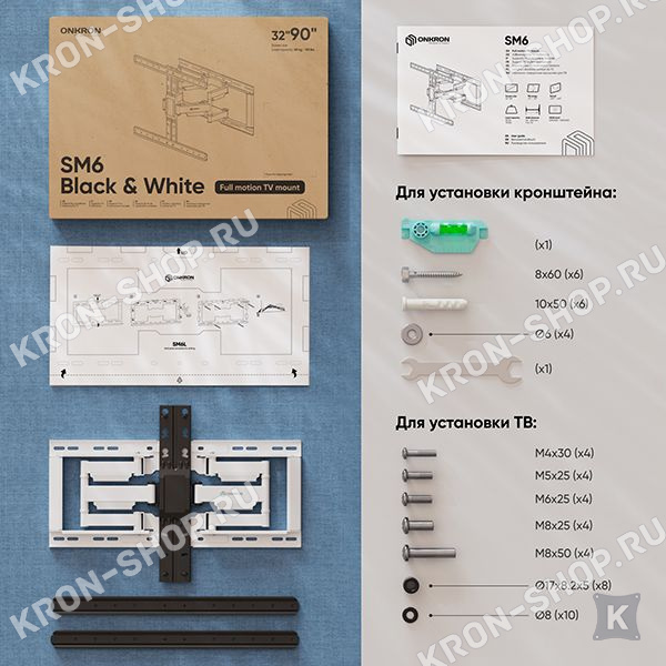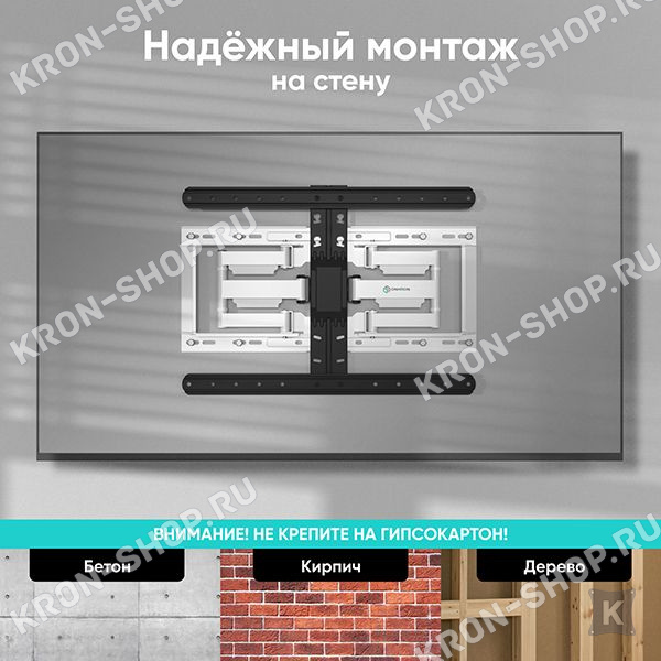 Настенный наклонно-поворотный кронштейн Onkron SM6W предназначен для телевизоров с диагональю от 32 до 90 дюймов. Конструкция кронштейна имеет широкий диапазон регулировки положения и перемещения телевизора, исключительную плавность движений.
