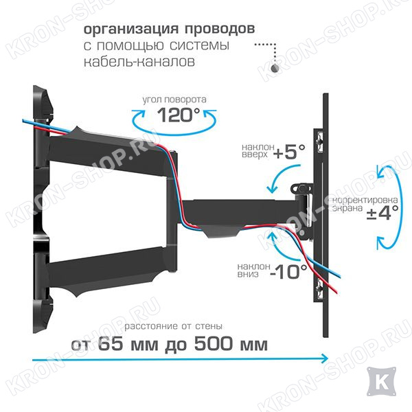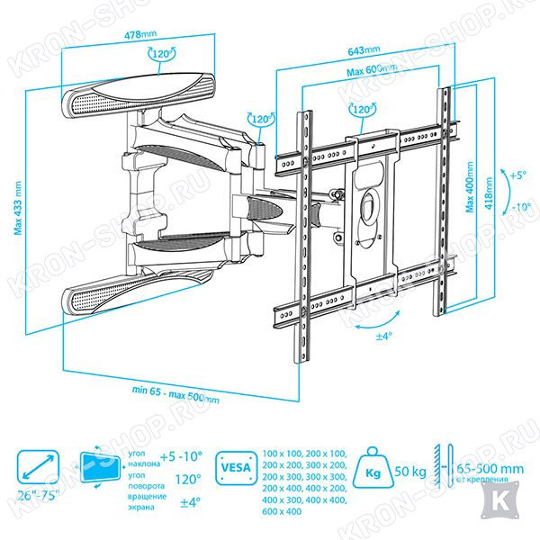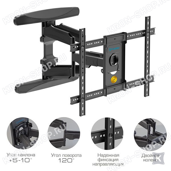 Настенный поворотно-наклонный кронштейн для телевизоров и мониторов с диагональю от 26 до 75 дюймов.