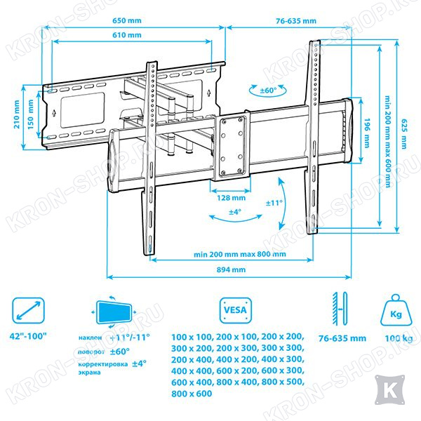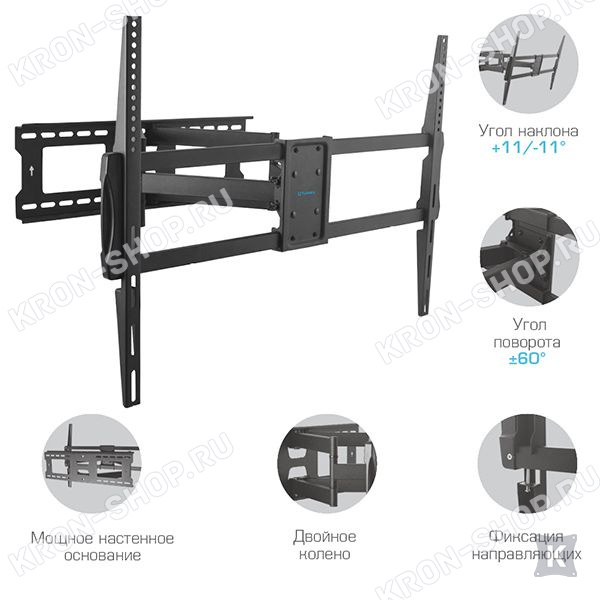 Настенный поворотно-наклонный кронштейн для телевизоров и мониторов с диагональю от 42 до 100 дюймов.
