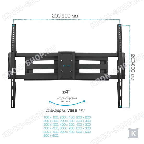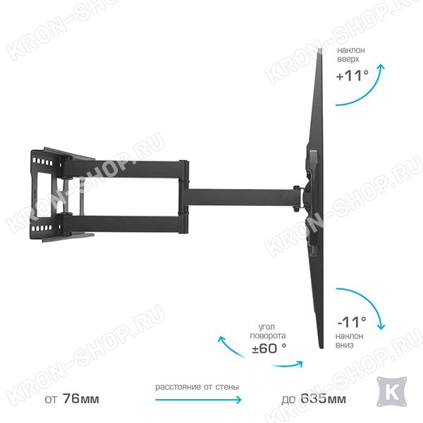 Кронштейн Tuarex Olimp-607 может использоваться с телевизорами весом до 100 кг. Возможен наклон до 11°, поворот до 60°. Расстояние телевизора от стены: 76-635 мм.