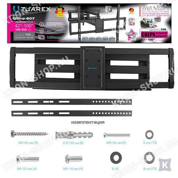 Для удобства инсталляции кронштейн Tuarex Olimp-607 поставляется с отсортированными крепежами для монтажа на стену.