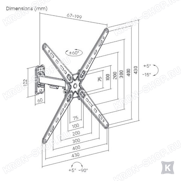 Настенный поворотно-наклонный кронштейн для телевизоров и мониторов с диагональю от 13 до 55 дюймов.