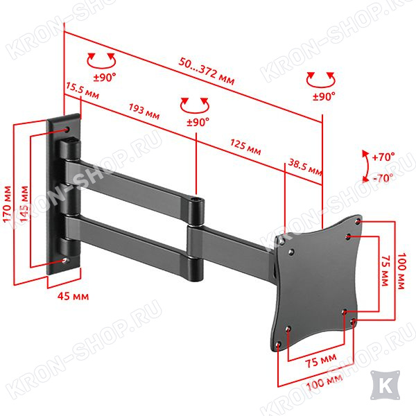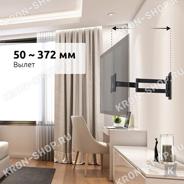 Экран ТВ можно вращать до 180° относительно стены, наклонять в диапазоне +-70°, регулировать вынос от стены от 50 до 372 мм, что делает его использование крайне удобным.