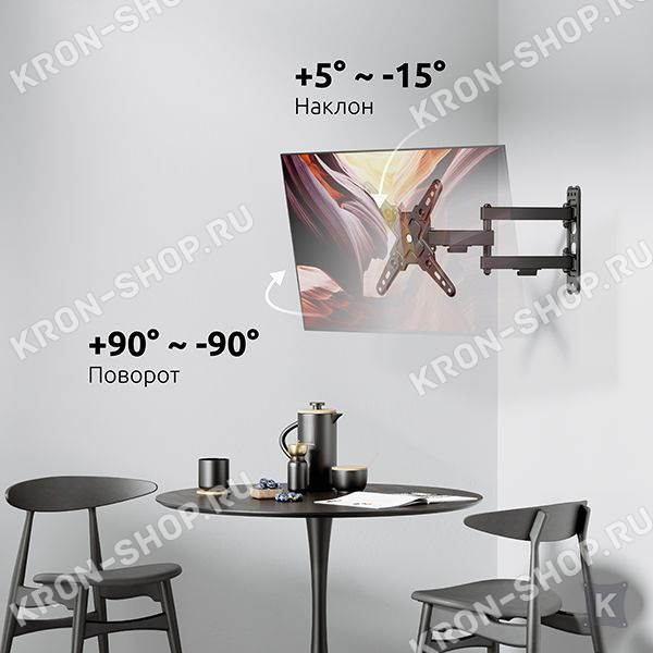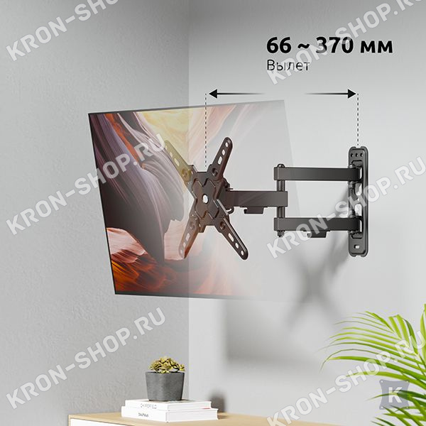 Экран ТВ можно вращать до 90° относительно стены, наклонять в диапазоне -15°, регулировать вынос от стены от 66 до 370 мм, что делает его использование крайне удобным.