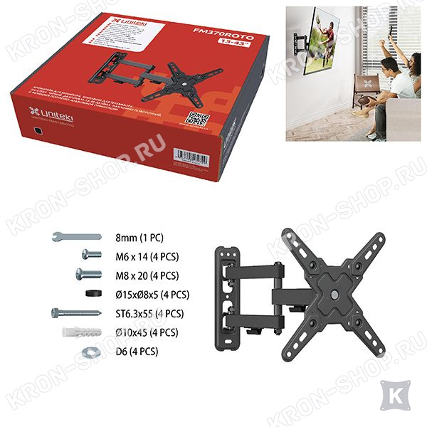 Регулируемое расстояние от стены до панели, несколько степеней свободы (наклон, поворот, сдвиг), простота и совершенство модели Uniteki FM370ROTO сделали его максимально удобным и доступным для наших покупателей.