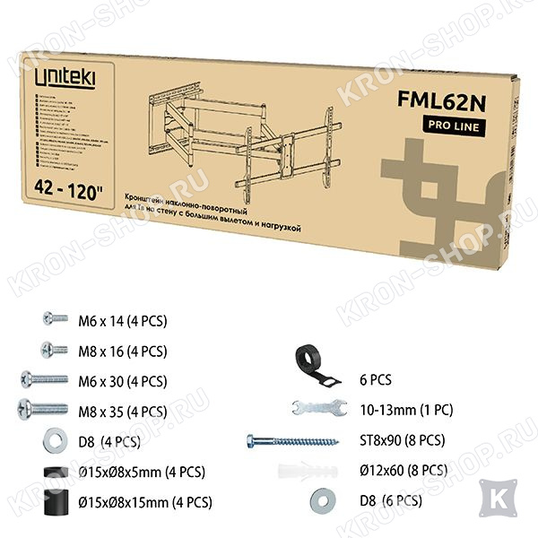 Наклонно-поворотный кронштейн Uniteki FML62N разработан для лучшей совместимости с большинством LCD/LED телевизоров и мониторов диагональю от 42 до 120 дюймов и максимальным весом 60 кг.