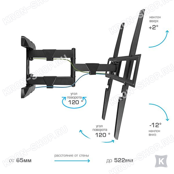 Настенный поворотно-наклонный кронштейн для телевизоров и мониторов с диагональю от 26 до 65 дюймов.