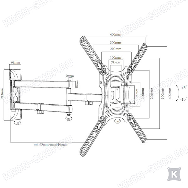 Шарнирное соединение с подвижным коленом дает возможность поворота экрана до 90 градусов влево-вправо (угол поворота зависит только от диагонали телевизора), а также позволяет регулировать расстояние от телевизора до стены от 55 до 610 мм.