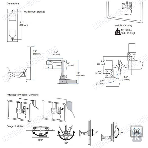 Настенный поворотно-наклонный кронштейн для телевизоров и мониторов с диагональю от 13 до 27 дюймов.