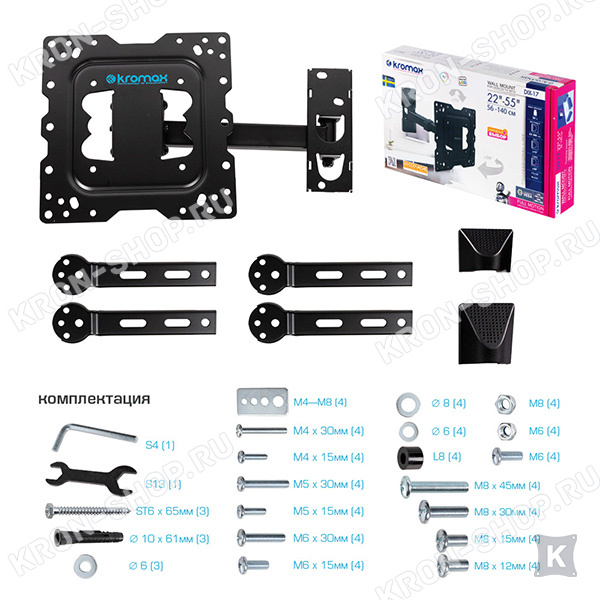 Kromax Dix-17 – стальной наклонно-поворотный кронштейн для телевизоров с диагональю экрана от 26 до 55 дюймов (66-140 см) и максимальным весом до 30 кг.