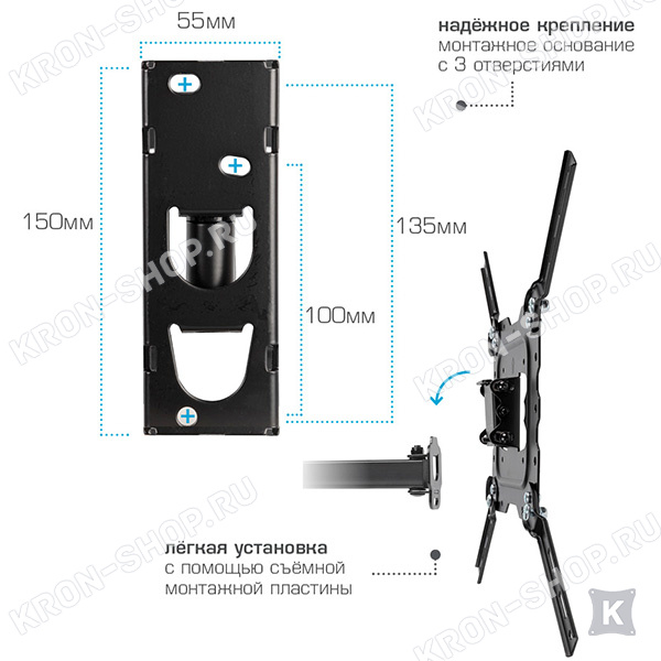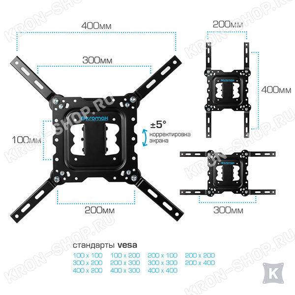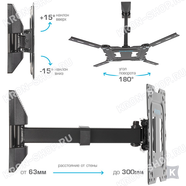 Кронштейн Kromax Dix-17 имеет множество возможностей регулировки таких как: наклон вверх-вниз на 15°, поворот влево или вправо на 90°, расстояние до стены от 63 до 300 мм.