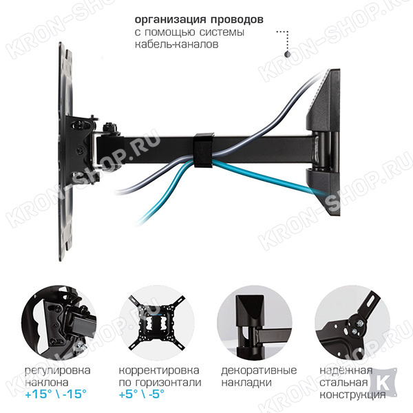 Настенный поворотно-наклонный кронштейн для телевизоров и мониторов с диагональю от 26 до 55 дюймов.