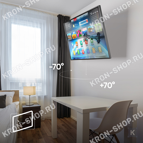 Кронштейн Onkron Basic R2 подходит для телевизоров с диагональю от 15" до 35". Конструктивно данный телевизионный кронштейн является наклонно-поворотным с изменяемым расстоянием от стены до 220 мм, что позволяет настроить необходимое расстояние уже после подвешивания.