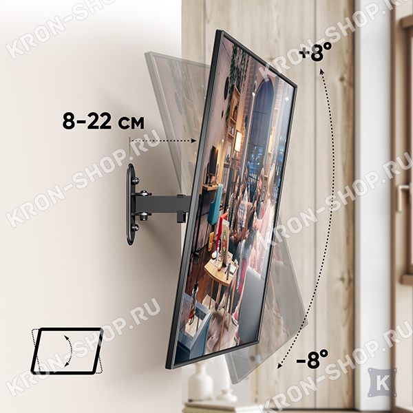 Лёгкая регулировка наклона – Надёжная конструкция без особых усилий позволит осуществить наклон даже тяжёлого телевизора лёгким движением на угол от -8 ° до +8°.