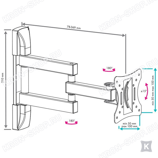Настенный поворотно-наклонный кронштейн для телевизоров и мониторов с диагональю от 32 до 65 дюймов.