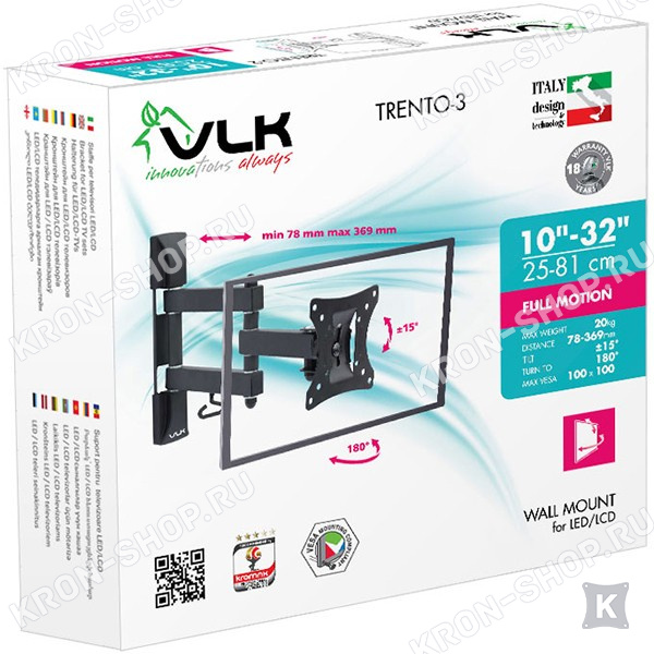 Кронштейн VLK Trento-3 изготовлен из высококачественной стали и способен выдерживать нагрузку до 20 кг. Конструкция кронштейна VLK Trento-3 способна наклонять ТВ на угол ±15°, а так же поворачивать на угол ±90°. Вы с лёгкостью можете установить любое удобное для просмотра положение экрана. Кронштейн легко установить на стену, благодаря съемной монтажной пластине.
