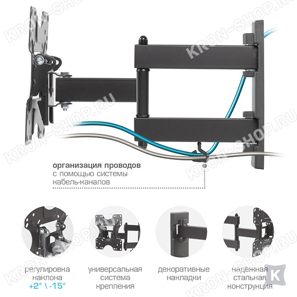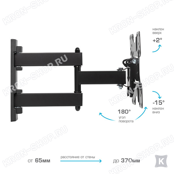 Настенный поворотно-наклонный кронштейн для телевизоров и мониторов с диагональю от 26 до 55 дюймов.
