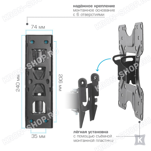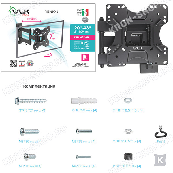 Кронштейн VLK Trento-6 изготовлен из высококачественной стали и способен выдерживать нагрузку до 25 кг. Конструкция кронштейна VLK Trento-6 способна наклонять ТВ на угол до 15°, а так же поворачивать на угол ±90°. Вы с лёгкостью можете установить любое удобное для просмотра положение экрана. Кронштейн легко установить на стену, благодаря съемной монтажной пластине.