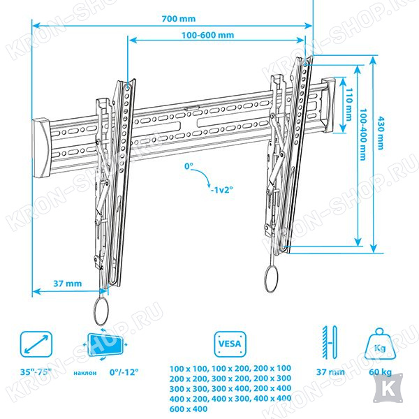 Настенный кронштейн с возможностью наклона для телевизоров с диагональю от 35 до 75 дюймов.