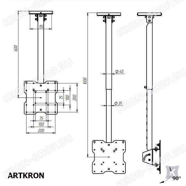 Потолочный кронштейн для телевизора ARTKRON DNT-20 имеет следующие функции: регулировка расстояния от потолка (600-1000 мм) и регулировка угла наклона до 90°.