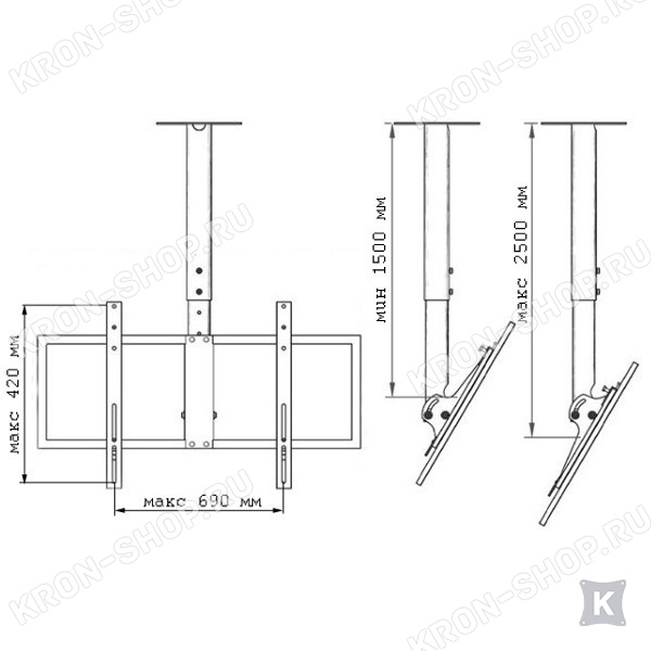 Кронштейн идеально подойдет для монтажа телевизора к потолку. Телевизор регулируется в 6 положениях по высоте с шагом в 10 см. Вы сможете подобрать наиболее удобное положение панели в зависимости от размеров помещения и величины аудитории. Декоративный потолочный фланец в комплект не входит (приобретается отдельно).