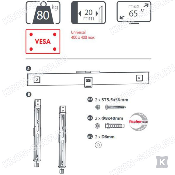 Настенный кронштейн с возможностью наклона для телевизоров с диагональю от 32 до 65 дюймов.