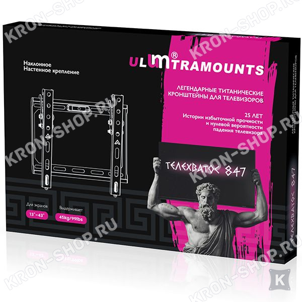 Кронштейн Ultramounts UM847 позволяет повесить телевизор или монитор весом до 45 кг с возможностью наклона до 8 градусов. Модель подходит для телевизоров или мониторов с диагональю до 43 дюймов.