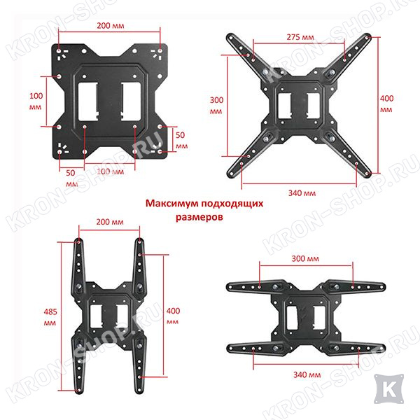 Максимальные посадочные размеры по горизонтали – 400 мм, по вертикали – 400 мм. Максимальная нагрузка на подставку – 40 кг. Предварительно отсортированные крепежные элементы для быстрой и легкой инсталляции.